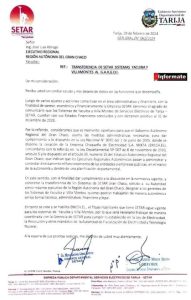 He tomado conocimiento sobre la nota del Gobernador Montes, sobre la voluntad de transferir solamente la decisión política de designar a los gerentes del sistema Setar Gran Chaco (Yacuiba, Villa Montes) por parte del Ejecutivo Regional del Gran Chaco en su calidad de M.A.E., pensando seguramente que con esta decisión se terminara el manoseo político de la empresa, actitud y conducta que fue siempre recurrente de las autoridades de turno de la capital.